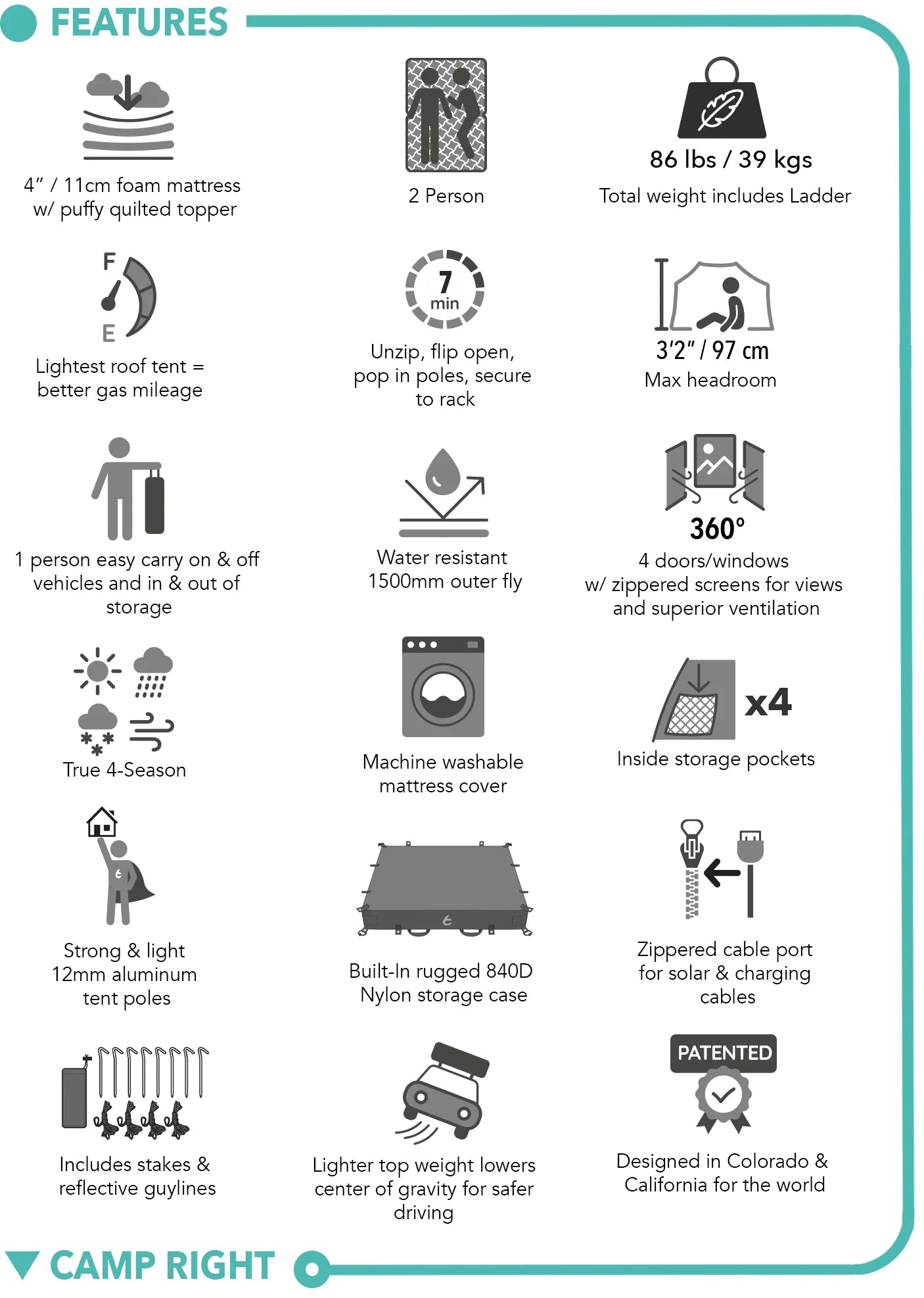 No need to haul it year-round—store it on a garage wall and mount it only when adventure calls. The Rev RTT supports up to 475 lbs (215 kg) of campers, pets, or gear—any combo you bring along.