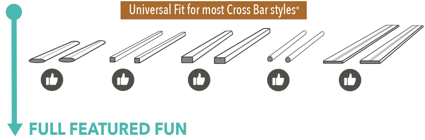 Included mounting hardware fits all styles of cross bars and rack slats as long as they are no wider than 4” / 100mm and no taller than 1.5” / 38mm